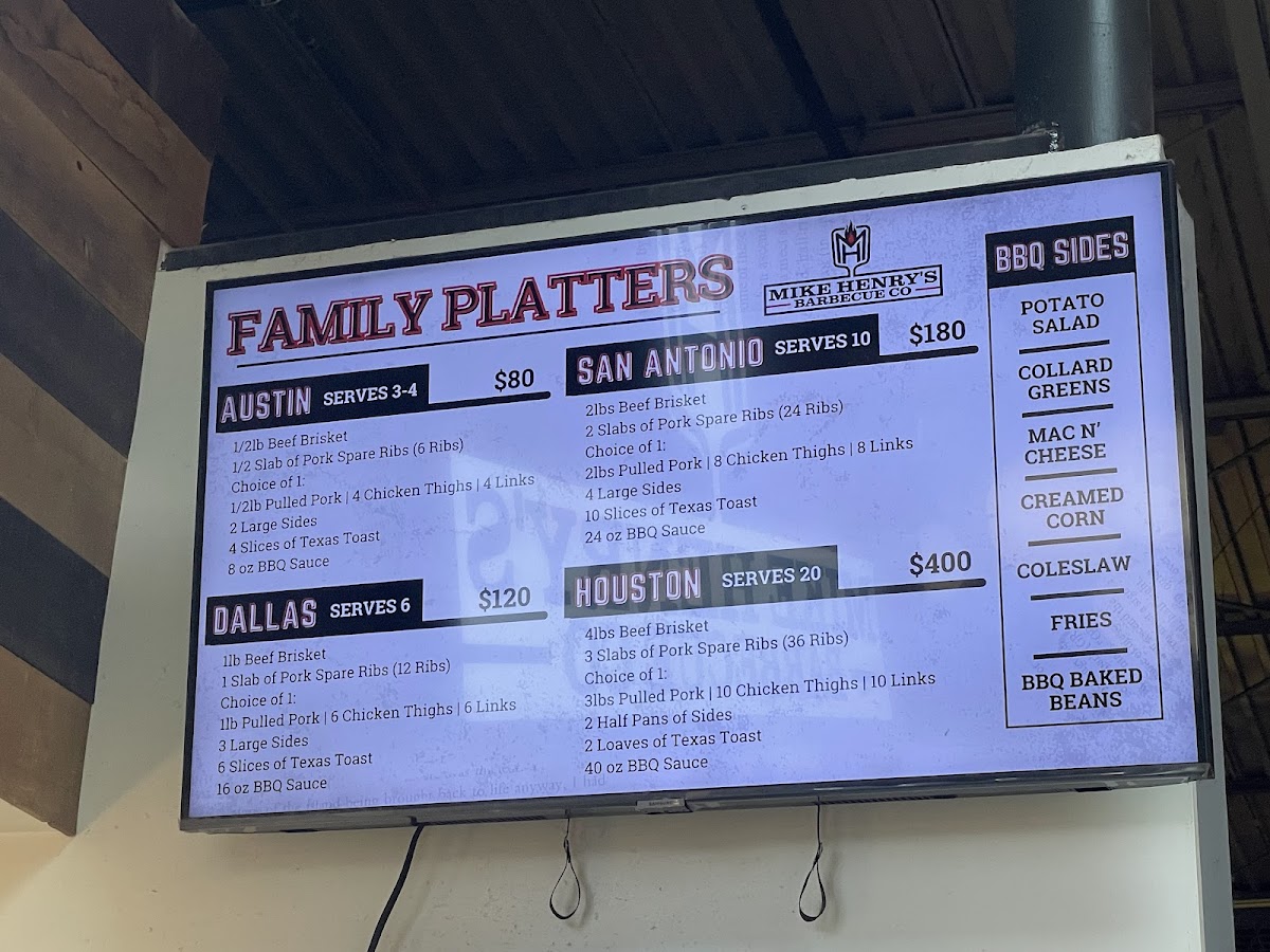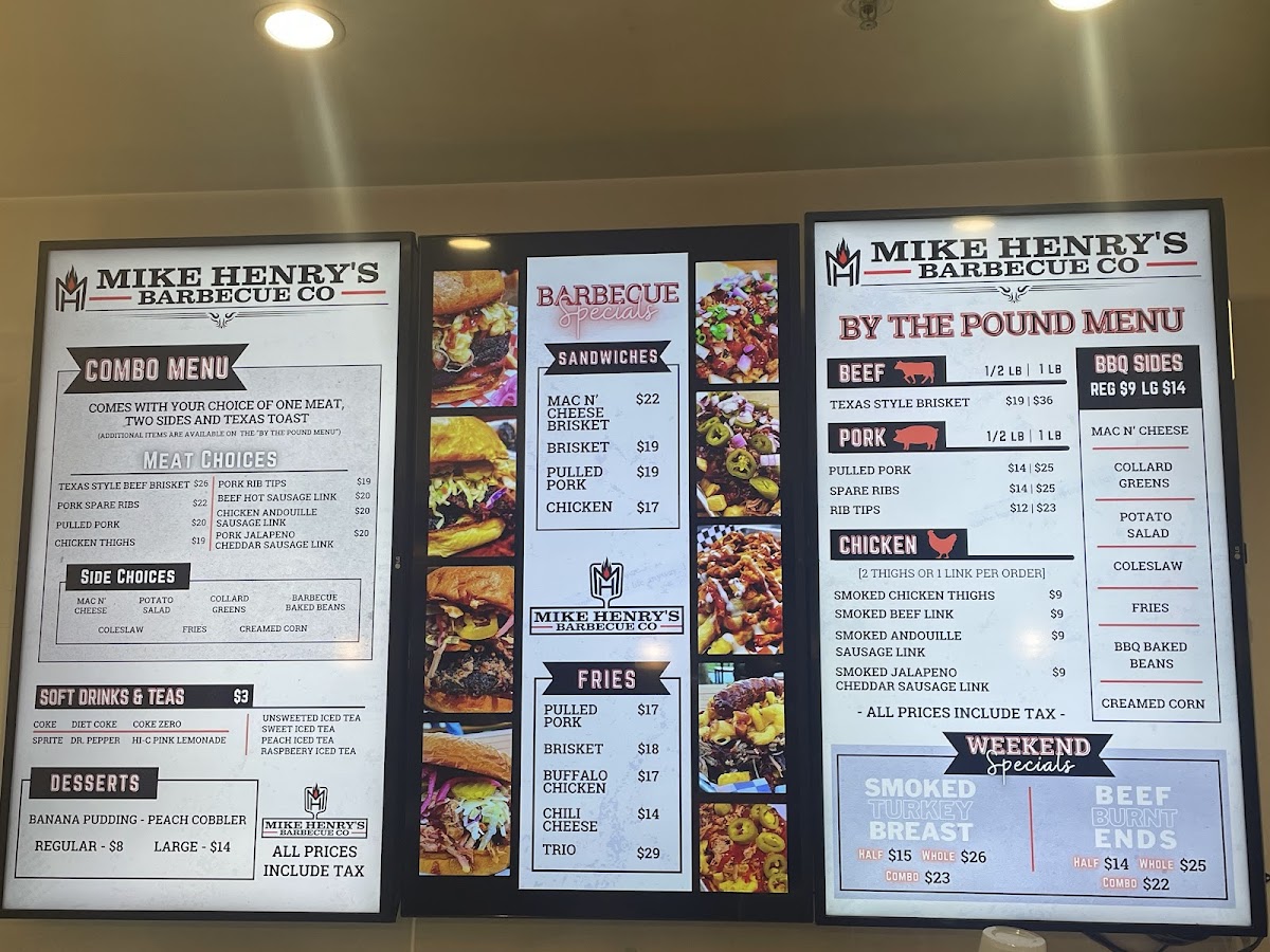 From a reviewer’s perspective, the menu at Mike Henry’s Barbecue Co offers a satisfying range of classic barbecue options that focus on hearty, smoked flavors and comfort food favorites. The sandwich selection includes the Pulled Pork Sandwhich, Brisket Mac N Cheese Sandwhich, Smoked Chicken Sandwich, and Brisket Sandwhich, giving guests a variety of rich, smoky choices. For sides, simple options like Small Side, Large Side, and Side Fries complement the mains well, while combo plates such as the Sausage Link Combo Plate, Smoked Spare Ribs Combo Plate, Chicken Thighs Combo Plate, Pulled Pork Combo Plate, and Brisket Combo Plate provide filling meals for those wanting a full barbecue experience. The menu also features indulgent items like Pulled Pork Fries, Brisket Fries, Smoked Buffalo Chicken Fries, and Trio Fries, plus desserts including Peach Cobbler Small, Peach Cobbler Large, Banana Pudding Small, and Banana Pudding Large. Overall, the menu is well-rounded, offering classic barbecue meats, comforting sides, and traditional desserts that make for a satisfying and flavorful dining experience.